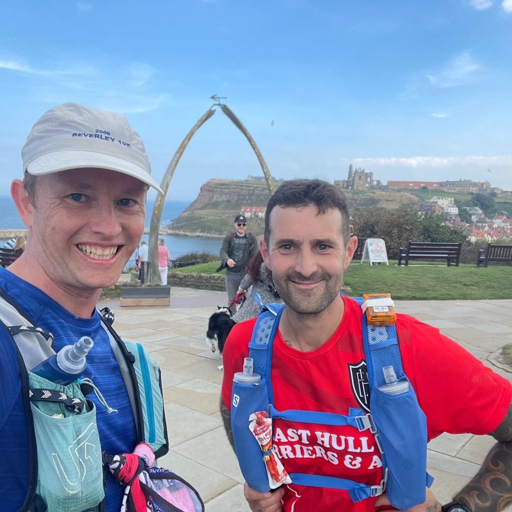 The views out of Saltburn and beyond are stunning. I have never walked the Cleveland way and I really wonder why not, it is just so beautiful. It’s open to the elements and I am sure it’s brutal on a wet/windy day but on a nice day it really is spectacular. I have to mention Staithes, how beautiful is that place, I will be visiting for a leisurely afternoon one day. A true gem. That was the beauty, the beast was the fact my water was running down. It’s a long section from Saltburn to Runswick Bay and even though I saw a club mate Adrian handing out water, I felt it more appropriate to make a joke then fill up my water bottle, what a mistake that was! So yes my water was rationed for 4-5 miles then it ran out, Runswick bay was more than the advertised 21 miles in and by the time I got there I was goosed. I sort of had been and sort of not been trying to catch James. I had seen him a few times on the climbs here and there in front of me, but he was too far to catch and if I am honest I was not 100% sure it was him. Red shirt, dark hair/cap, dark shorts….but was is James? Turned out it was, he got to the checkpoint 5 minutes or so before me so we were similar speed on that section. James had had 5 minutes to sort himself out and having had a tough section himself was starting to feel better. I needed lots of liquids and my sandwich and a bit of time to get my head back in the game, which I did. Having set of slowly from Runswick bay with James I came around and felt a bit better. I always say to myself when struggling that it’s ups and downs and one follows the other, I say it when I feel good too. So we cracked on. We both realised we had set off too fast, that it was way too hot and we both just wanted to finish and the time did not matter. So we progressed, bit after bit and talking to a few people the time flew by. Sandsend was the next checkpoint and my wife Kristina was there which was lovely and although we were tired we were doing ok. A walk for a minute or two out of Sandsend with Kristina was nice and it wasn’t long before we could see Whitby in the distance. The stunning views kept on coming and the temperature did drop a little, although it was still hot. I remember when we were approaching Hornblower which is an old (is it still in use?) fog horn station, all I wanted was a cup of coke, but all that was on offer was water. Still, I filled up and drank away and we progressed. The marshals at Hornblower were funny and pleasant, but when they said it was 8 miles to Ravenscar I was not laughing, it felt like a long long way. It was nice to see Kristina in this section too, a bright happy face and Oasis of joy, it helps lift spirits!