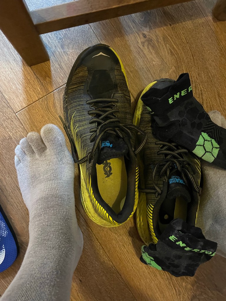 Time heals, and I entered the 2022 event, with one of the main goals to see if I can keep my feet in decent shape. Out went the INOV-8 G270’s from 2021 an in came the Speedgoat Evo’s. Out went Vaseline as lubricant and in came Sudocream. Out went INOV-8 Trail socks and in came Injini Liners with a second thin Enertor Sock as an outer sock.